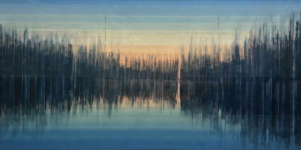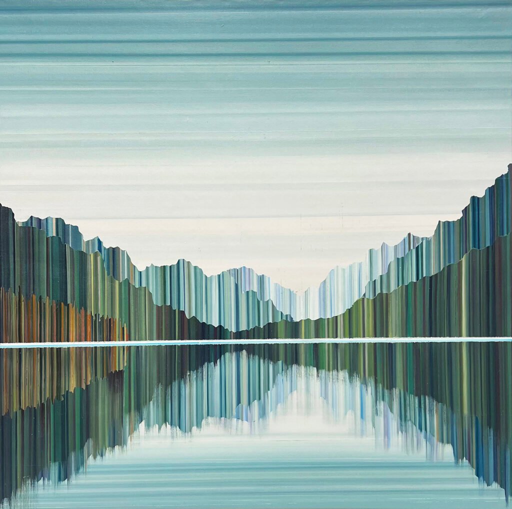 Transience and Permanence: The ever-changing surface of water, with its ripples or waves, can symbolize the fleeting nature of thoughts and emotions, while the steadfast mountains represent enduring aspects of the self or the soul. This contrast highlights the tension between impermanence and stability in the human experience. By weaving these themes together, the exhibition presents the artworks as visual metaphors for the mind’s reflective processes, inviting viewers to contemplate how their own minds mirror and interpret the world around them.